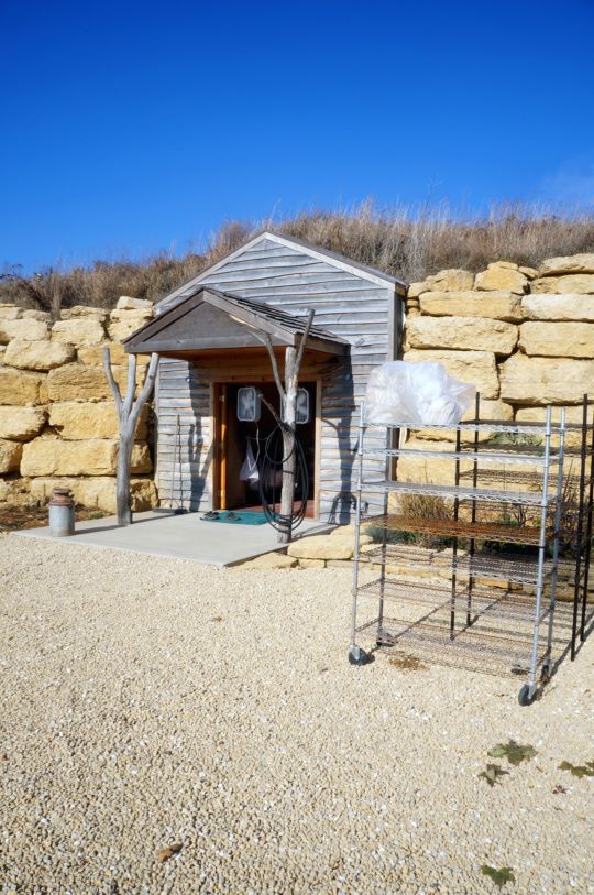 The structure itself is an elongated dome, split into two distinct aging rooms. Each cave rests at distinct temperature and humidity levels, calibrated for different cheese styles. One for the delicate soft ripened cheeses, and the other for his Bandaged Cheddars and tommes.