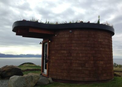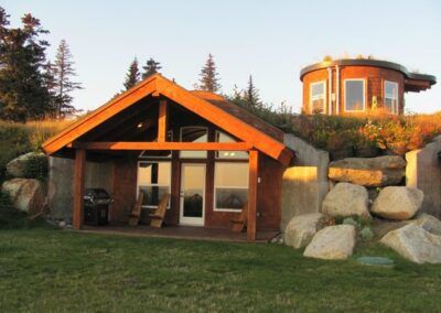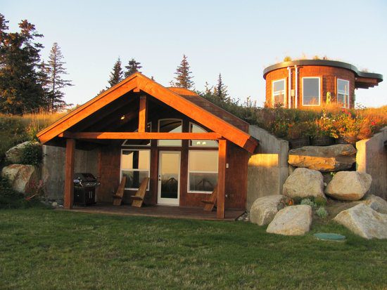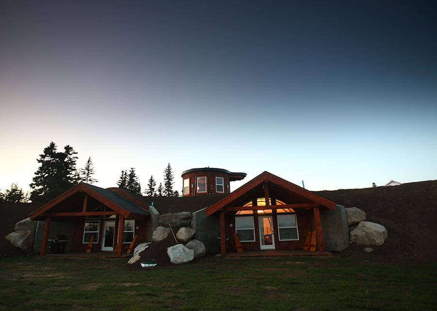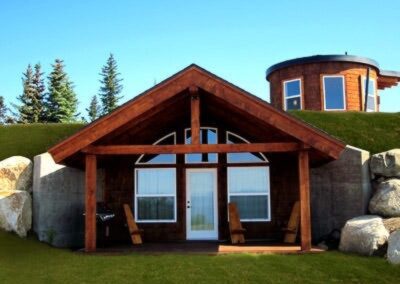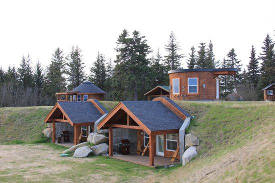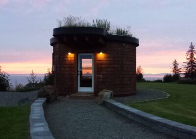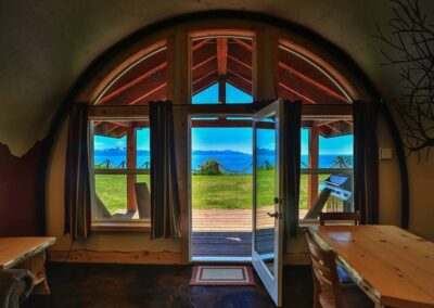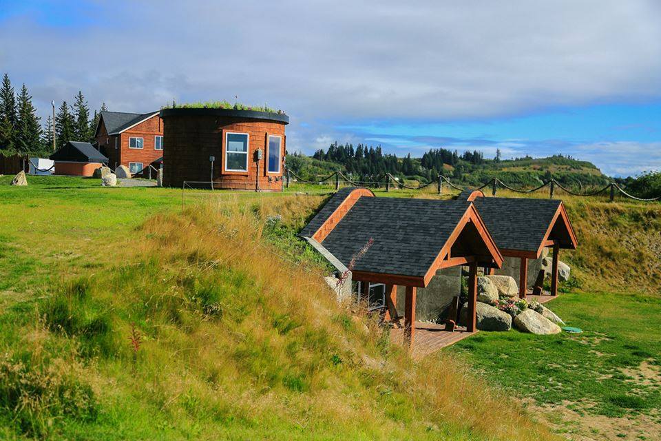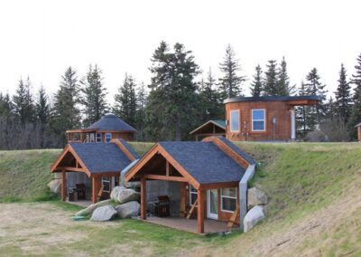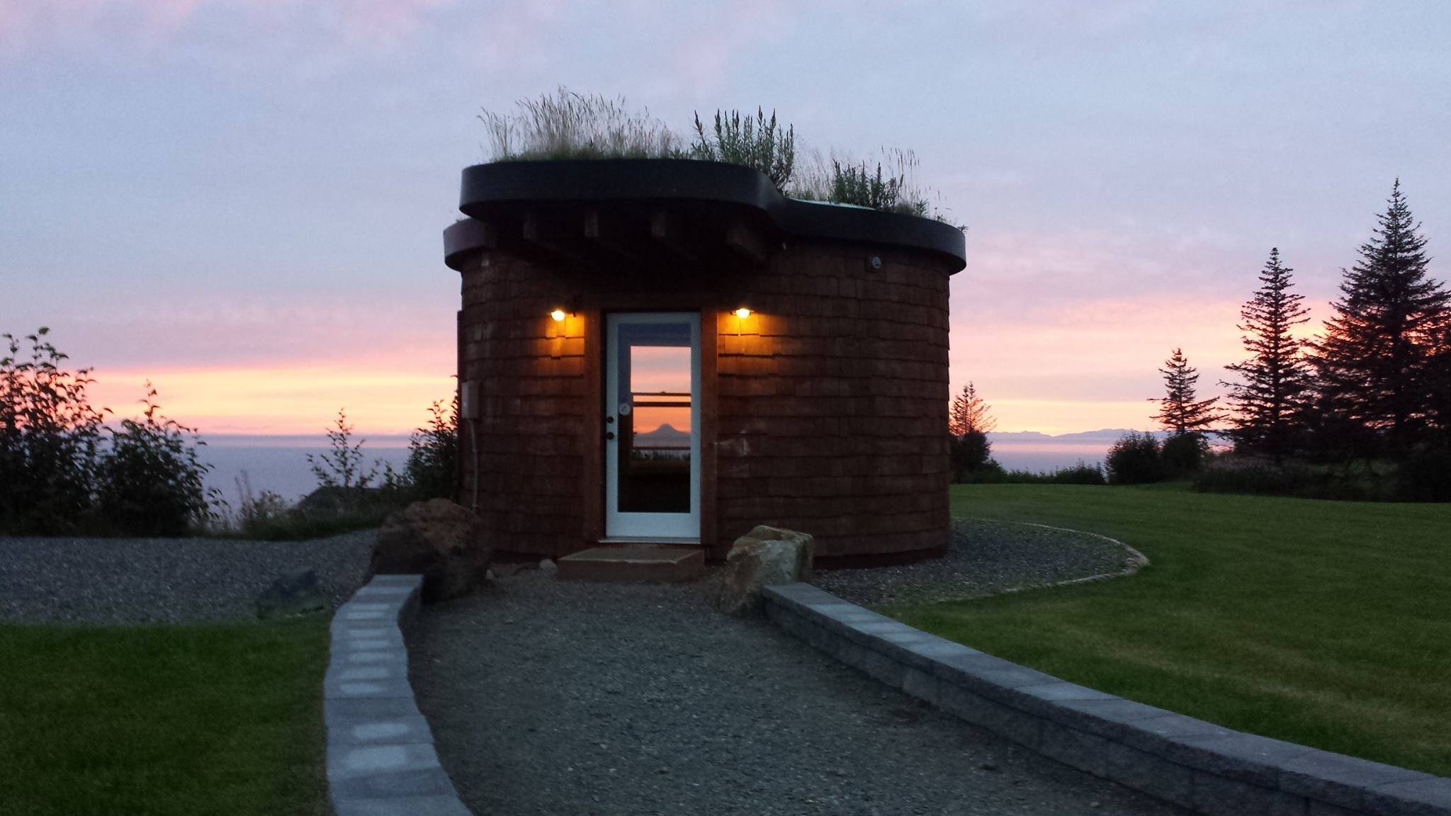 Built into the grassy bluff, these modern underground cabins each offer a covered porch and amazing views of Kachemak Bay. Enter the den from above using the circular staircase into a half-moon shaped, open living area with beautiful wood furnishings and a kitchenette. These 480-square-foot underground luxury cabins offer incredible privacy, sound proofing, and eco-friendly grass roofs. Take in breathtaking views of Kachemak Bay and snow-topped mountains from the 200-square-foot covered deck.
