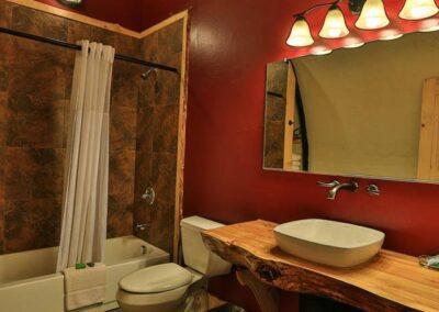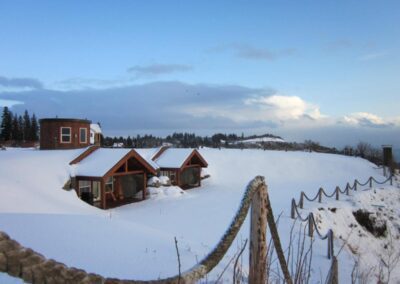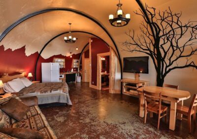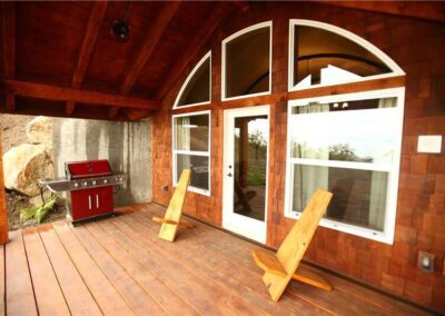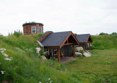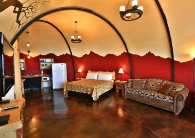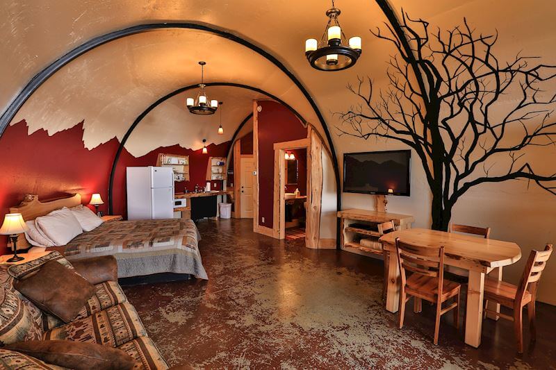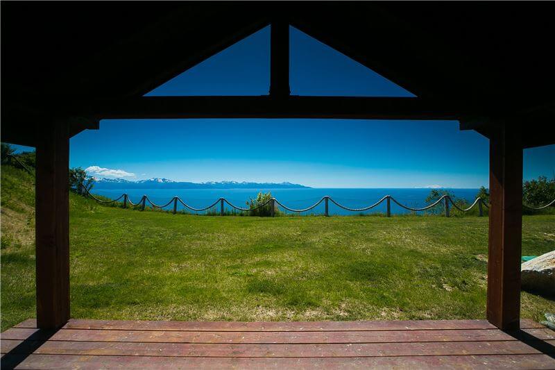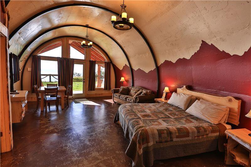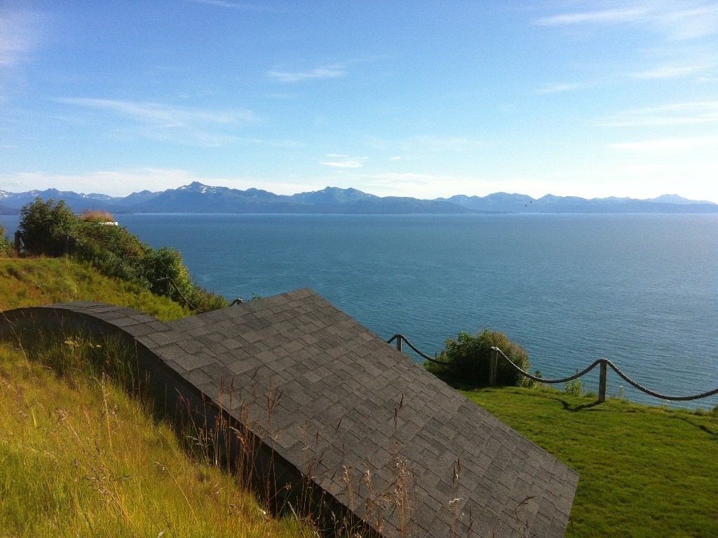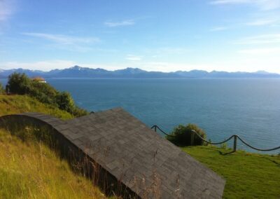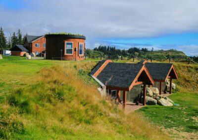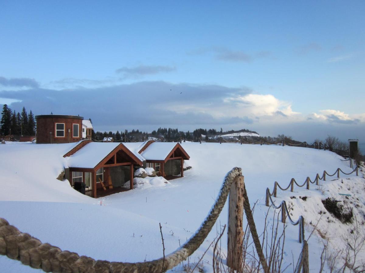 Built into the grassy bluff, these modern underground cabins each offer a covered porch and amazing views of Kachemak Bay. Enter the den from above using the circular staircase into a half-moon shaped, open living area with beautiful wood furnishings and a kitchenette. These 480-square-foot underground luxury cabins offer incredible privacy, sound proofing, and eco-friendly grass roofs. Take in breathtaking views of Kachemak Bay and snow-topped mountains from the 200-square-foot covered deck.