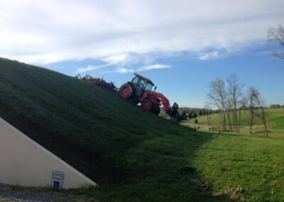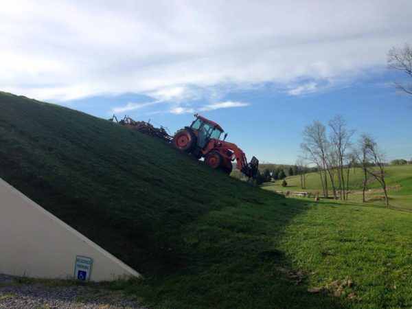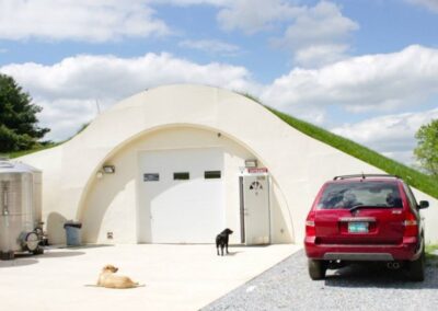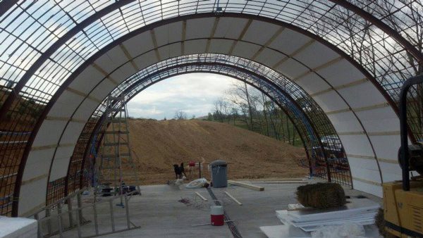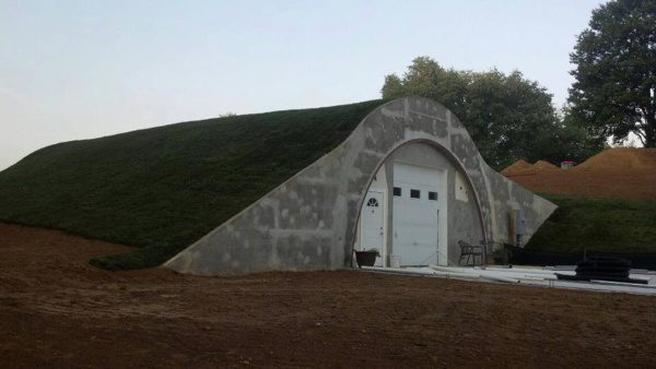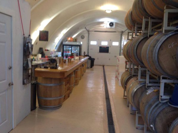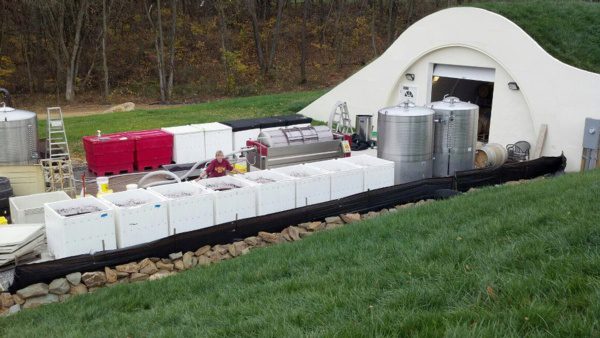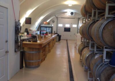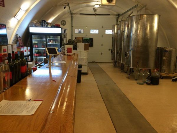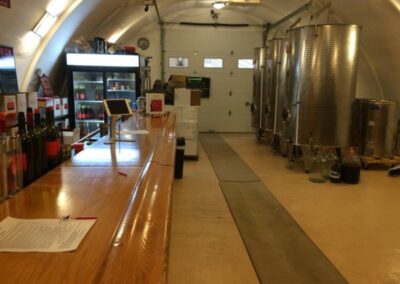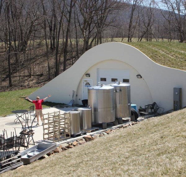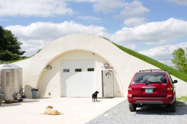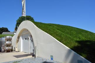 This wine cave is covered with 4 feet of earth and grass is growing on the roof. This helps the wine cave maintain a constant temperature and reduce energy costs. The Wine Cave has a lower carbon foot print than a traditional above ground winery. The Wine Cave serves as both the tasting room and the production facility.