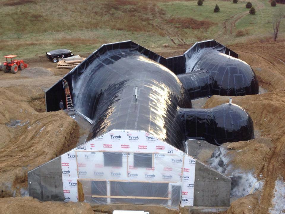Depending on the specific building site location, an umbrella system may be utilized; incorporating a drain mat that will be placed in addition to the waterproofing membrane. The drain mat combines geotextile filter fabrics with specially designed drainage cores that will insulate the mass of the earth surrounding the structure. Excess ground water will be shed away from the structure as well as the surrounding earth. The soil surrounding the home is kept dry, minimizing the effects of soil temperatures around the structure. The result is a comfortable indoor temperature that varies only six or eight degrees during an entire year, while outdoor air temperatures may vary from minus 40 to more than 100 degrees F.